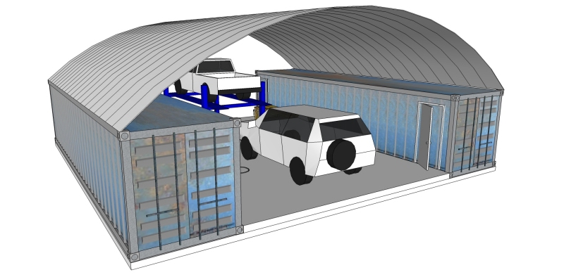 The images give you the general idea. Take 2 40' ISBUs, put an arch over them, and you have an instant shop. I love using the arches for roofs in my designs. They just make so much more sense than a flat roof. By using the SteelMaster type arch, you can eliminate trusses and gain a lot of useable area.