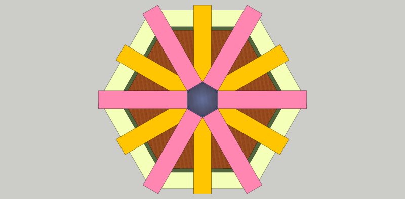 the corners of the pink units, and the horizontal beams in a hexagon pattern